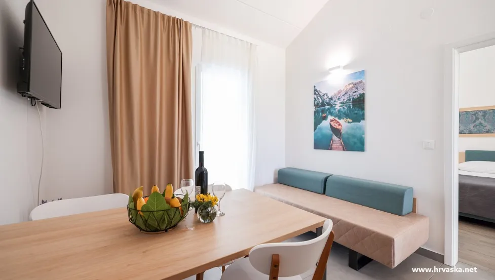 Turistično naselje z 205 apartmaji. Obnovljeni med letom 2018 in 2023. Apartmaji se nahajajo od 80 do 300 m od morja.91 x Tip A (2+1) Superior**** - 40 m² - ena spalnica z dvema ležiščema, raztegljiv kavč v dnevni sobi (primeren za enega otroka do 12 let), telefon, kopalnica in WC, klima v vsaki sobi. V pritličju s teraso.