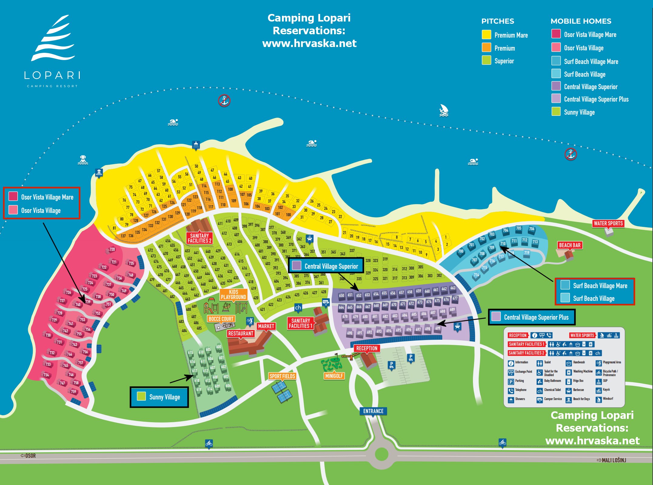 Mobilne hišice se nahajajo cca 150 m od morja v manjšem kampu, ki sprejme do cca 1000 oseb. V bližini se nahaja zgodovinsko mestece Osor ter vznožje hriba Osoršćica.V kampu se nahaja 800 m dolga prodnata plaža, ki je v delu prilagojena tudi za otroke in njihovo brezskrbno igro. Bližina hriba Osoršćica, ponuja gostom aktivne počitnice ter raziskovanje narave.