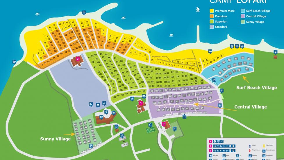 - od 20 m do 250 m od plaže- Plaža v kampu je večinoma prodnata s peščenimi zalivi. Kamp ima odlično senco mediteranskih dreves.