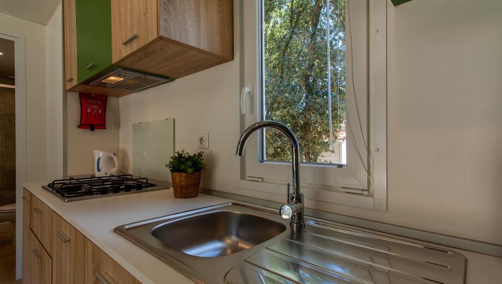 - Mobilne hišice imajo klimatsko napravo, satelitsko televizijo, popolnoma opremljeno kuhinjo s posodo in jedilni pribor. Posteljnina in brisače so v ceni. Na terasi se nahaja vrtno pohištvo.