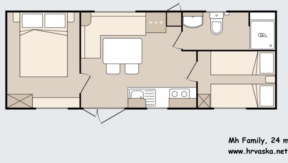 - Mobilna hišica je velika 36 m2.- Maximalno število oseb: 4 odrasle in 1 otrok do 11,99 let