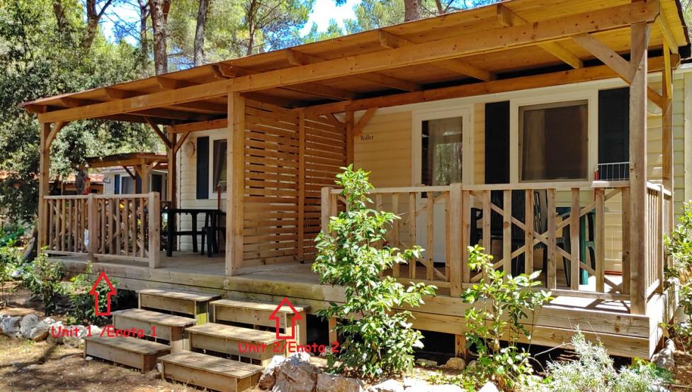 Hiška DVOJČEK! V isti hišici, pod isto streho bivajo še drugi gostje! Vaša enota je velika 12 m2. Za 2 odrasli osebi,spalnica z zakonsko posteljo, kopalnica (umivalnik, tuš/wc), kuhinjska niša (štedilnik, hladilnik, lonci in ponve, krožniki, jedilni pribor, etc.), klima naprava, pred hišo nadkrita lesena terasa s kompletom vrtnega pohištva.