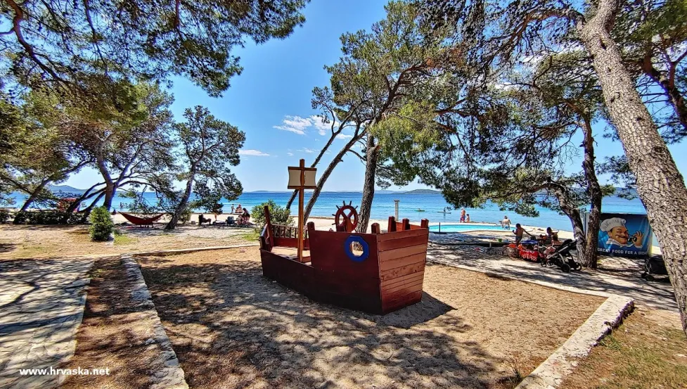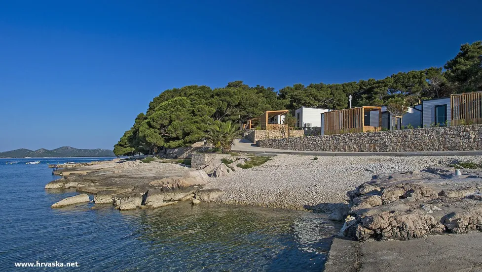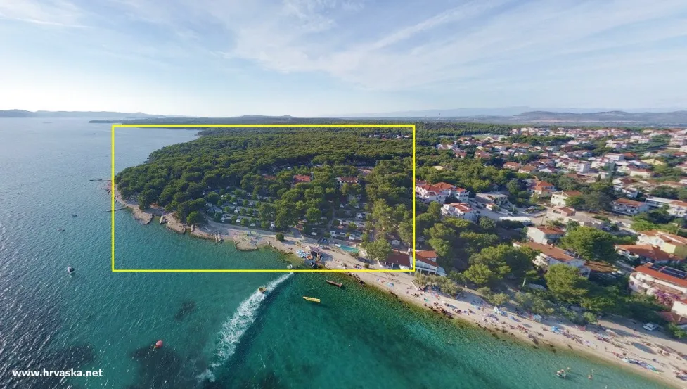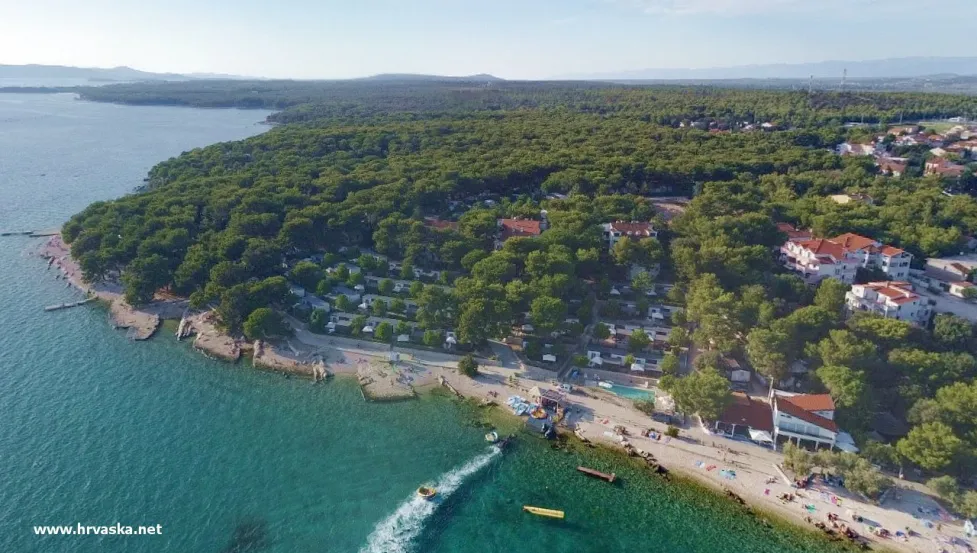 Mobilne hišice v priljubljenem z borom poraščenem kampu - Camping Kozarica Pakoštane. Kamp se nahaja ob betonsko/prodnati plaži, le 10 minut sprehoda iz centra ter ima manjši zunanji bazen. Pakoštane, Dalmacija, Hrvaška.