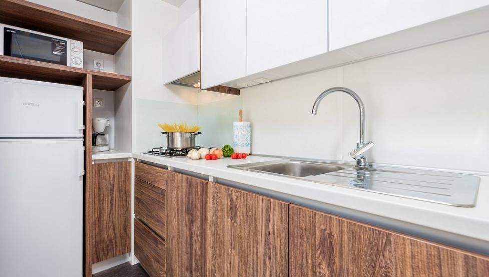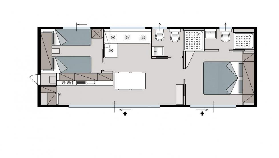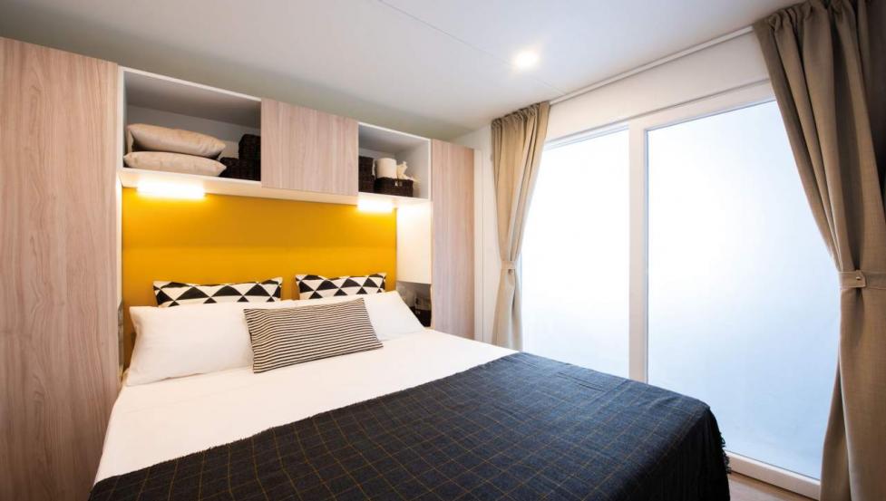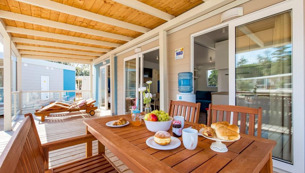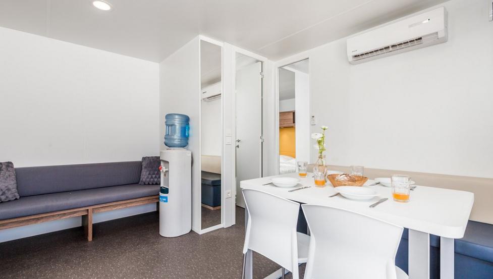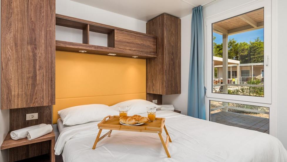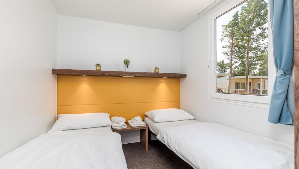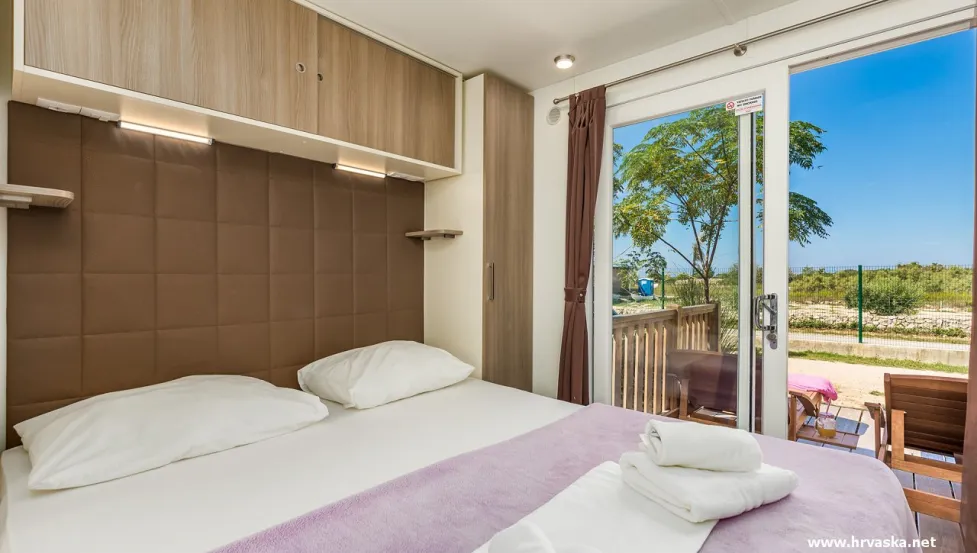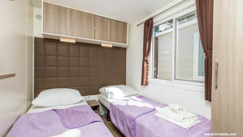 Površina Premium mobilne hiške znaša 34,4 m2 in se nahaja nedaleč od otroškega igrišča ter plaže.- mobilna hiška je na voljo v več različicah.