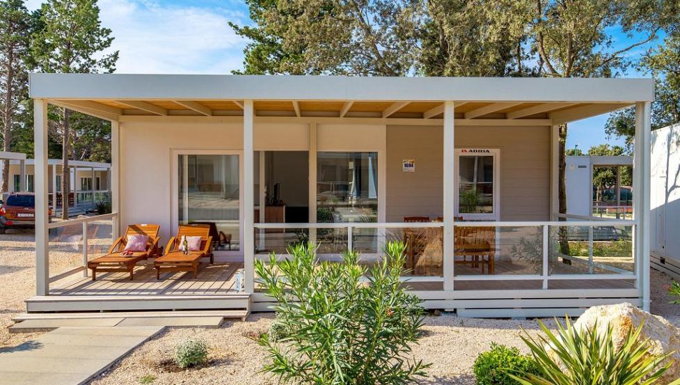 Površina Adria mobilne hiške znaša 34,4 m2 in se nahaja nedaleč od bazenskega kompleksa, animacije ter športnih terenov. Namenjene so štirim odraslim osebam in enemu otroku do 12 let. Vse hišice so kompletno opremljene ter imajo prostorno nadkrito teraso. Parkirni prostor za osebni avtomobil se nahaja takoj zraven hiške.maks. 50 m – 100 m od morja